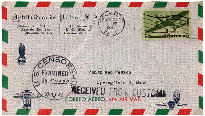 | Firm with address on both sides of Mexican border. Letter evidently carried across to U.S. where it was turned over to customs. The Customs and Censor handstamps are listed in Broderick/Mayo as being from Los Angeles. The censor number is consistent with Mayo's incomplete Traveler's series.